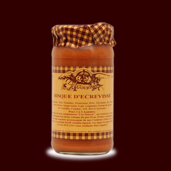 Eau, ECREVISSE 16%, Tomate, Vin blanc, Oignon, Carotte, Poireau, Riz, Concentré de tomate, Sel, BEURRE, Huile d’olive vierge extra, LAIT, Epaississant : Farine de graines de caroube, Cognac, Ail et Poivre.