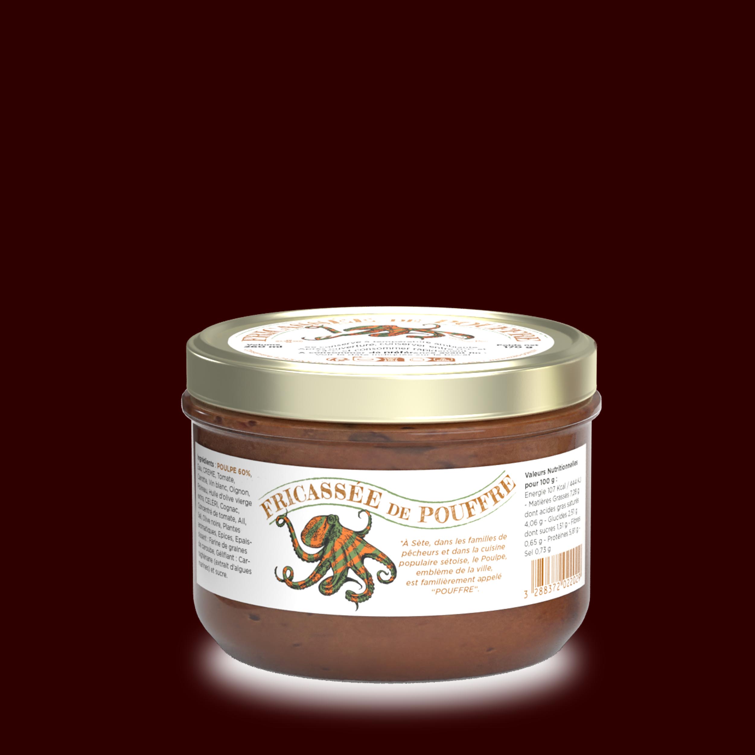 POULPE 26%, Eau, CREME, Tomate, Carotte, Vin blanc, Oignon, Poireau, Huile d’olive vierge extra, CELERI, Cognac, Concentré de tomate, Ail, Sel, Olive noire, Plantes aromatiques, Epices, Epaississant : Farine de graines de caroube, Gélifiant : Carraghénane (extrait d’algues marines) et sucre