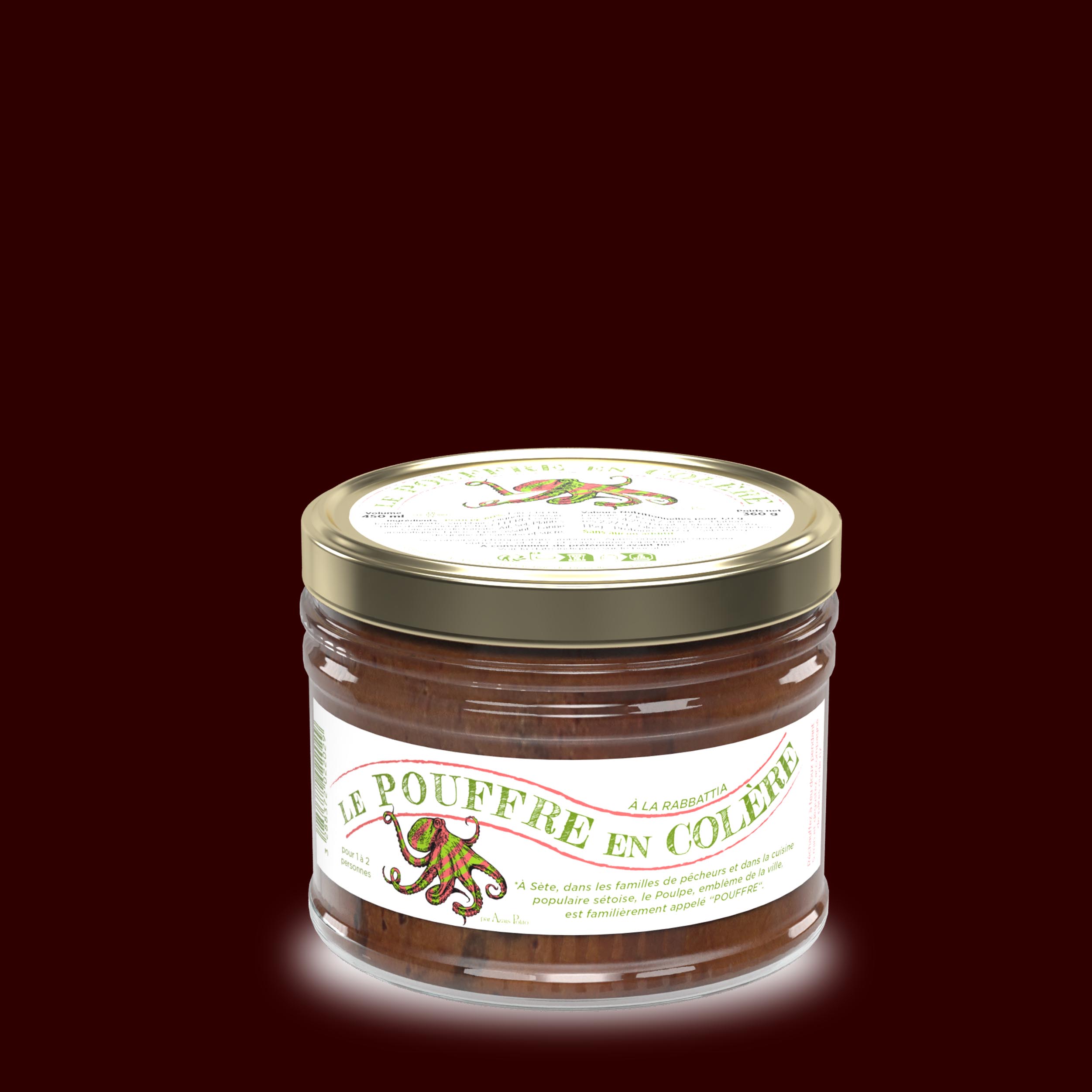 POULPE 55%, Eau, CREME, Tomate, Carotte, Vin blanc, Oignon, Poireau, Huile d’olive vierge extra, CELERI, Cognac, Concentré de tomate, Ail, Sel, Plantes aromatiques, Epices, Epaississant : Farine de graine de caroube et sucre.