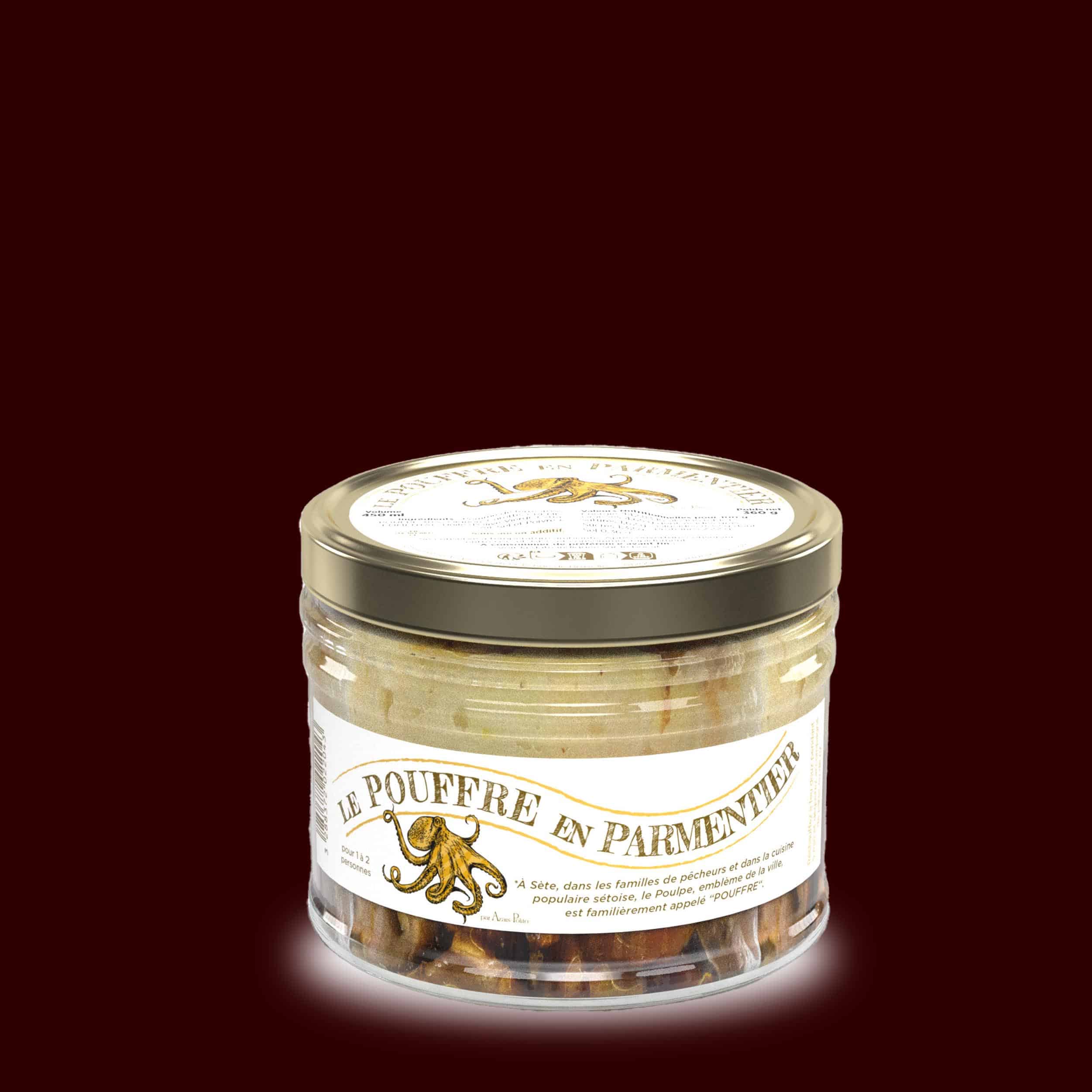 Pomme de terre 38 %, POULPE 28%, Oignon, LAIT, Carotte, Huile d’olive vierge extra, EMMENTAL, Sel Et Poivre.