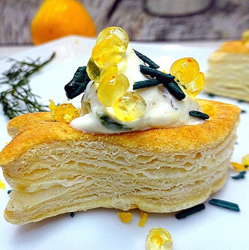 Mini bouchée poisson à la brandade, spiruline avec des perles de jus de mandarine